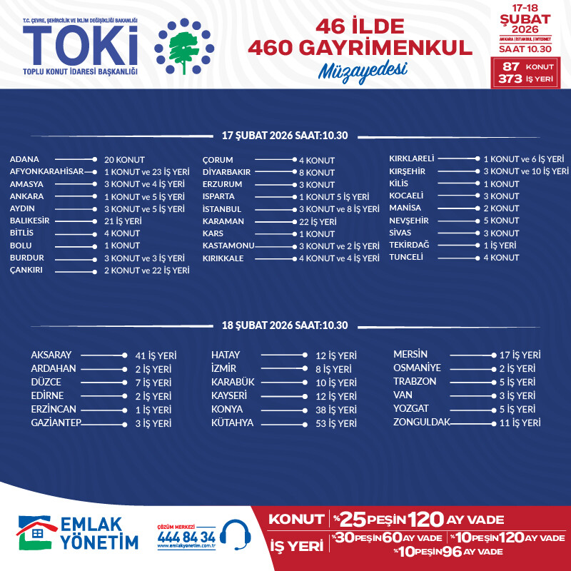 TOKİ EMLAK YÖNETİM HİZMETLERİ VE TİCARET A.Ş. Açık Artırma ve İş Geliştirme Müdürlüğü tarafından odamıza iletilen yazıda; 17-18 Şubat 2026 tarihinde yapılacak olan 46 ilde 460 gayrimenkul satışı kapsamında Gaziantep ili Şehitkamil ilçesinde 3 adet gayrimenkul satışa sunulacaktır.