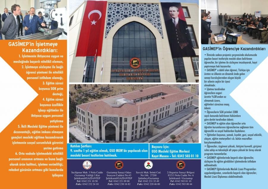 Gaziantep Sanayi Odası (GSO) Yönetim Kurulu Başkanı Adnan Ünverdi, GSO ile Milli Eğitim Bakanlığı (MEB) arasında gerçekleştirilen protokol ile hayata geçirilen, Gaziantep Sanayici İşbirliğinde Mesleki Eğitim Projesi’nin (GASİMEP) ilk yılında iş dünyasından yoğun ilgi gördüğünü belirterek, 140 firmanın başvuruda bulunduğu proje kapsamında, mesleki beceri testini geçen 22 öğrencinin 13 firmada personel öğrenci olarak iş hayatıyla buluştuğunu ve önümüzdeki eğitim öğretim sezonunda tüm talepleri karşılamak üzere çalışmalarını sürdürdüklerini kaydetti.***