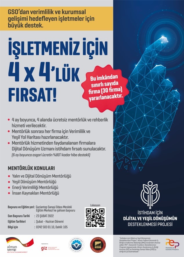 Alman İşbirliği Kurumu ve Odamız iş birliği ile yürütülen "İstihdam İçin Yeşil ve Dijital Dönüşümün Desteklenmesi" projesi kapsamında işletmelerimizin verimliliklerinin arttırılması, dönüşüm süreçlerinin desteklenmesi amacı ile;