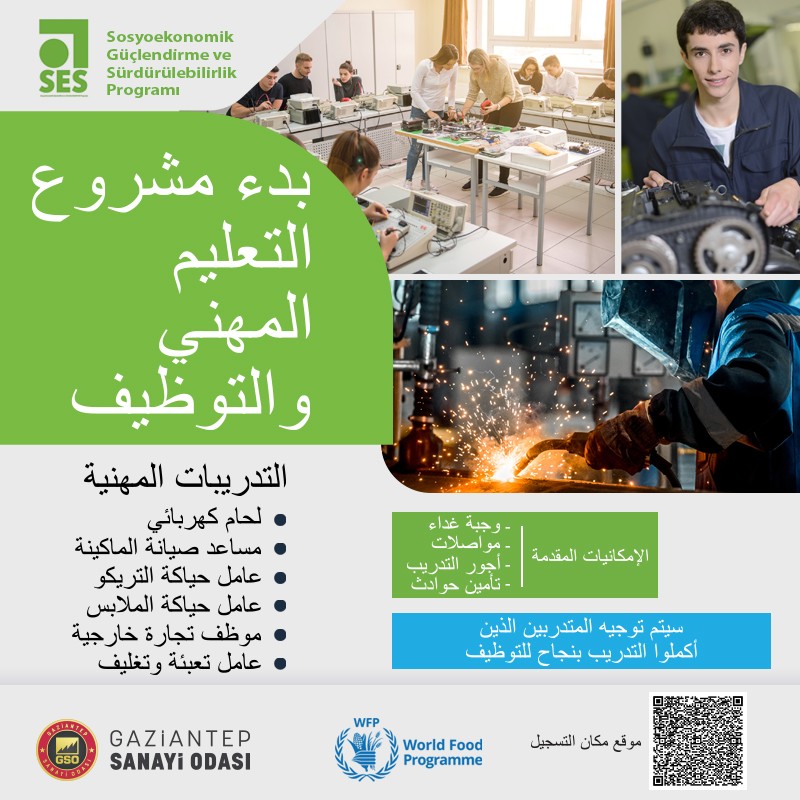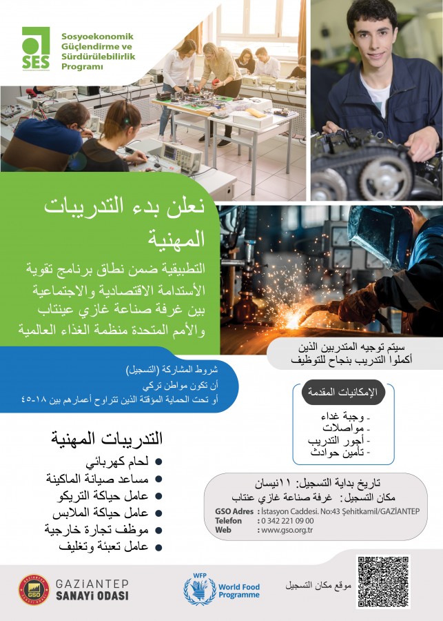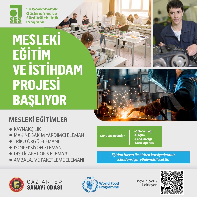 Sosyoekonomik Güçlendirme ve SürdürülebilirlikProgramı (SES) kapsamında Gaziantep Sanayi Odası (GSO) ve BM Dünya Gıda Programı (WFP) tarafından Mesleki ve Uygulamalı eğitimler başlıyor.