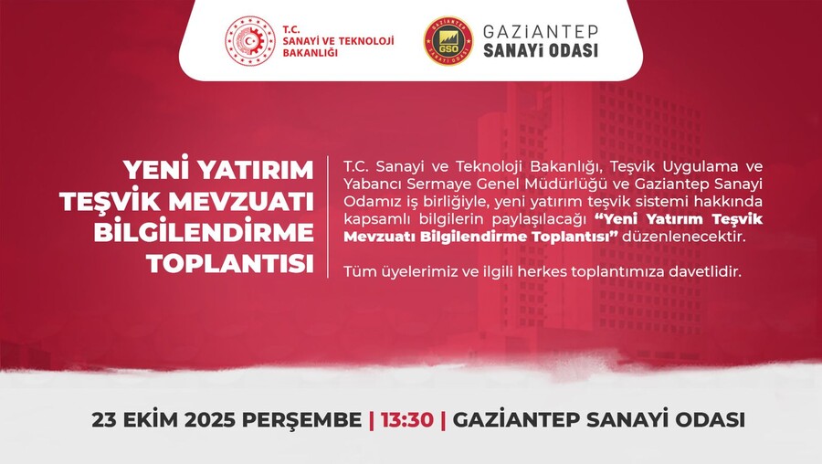 T.C. Sanayi ve Teknoloji Bakanlığı, Teşvik Uygulama ve Yabancı Sermaye Genel Müdürlüğü ve Odamız iş birliği ile 23.10.2025 tarihinde ve 13:30 Odamız Meclis Toplantı Salonunda Yeni Yatırım Teşvik Mevzuatı Tanıtım ve Bilgilendirme Toplantısı yapılacaktır. Toplantıda Sanayi ve Teknoloji Bakanlığı uzmanlarınca katılımcılara yeni teşvik sistemi ile ilgili bilgi verilecek olup, katılımcılardan gelecek sorulara da cevap verilecektir.