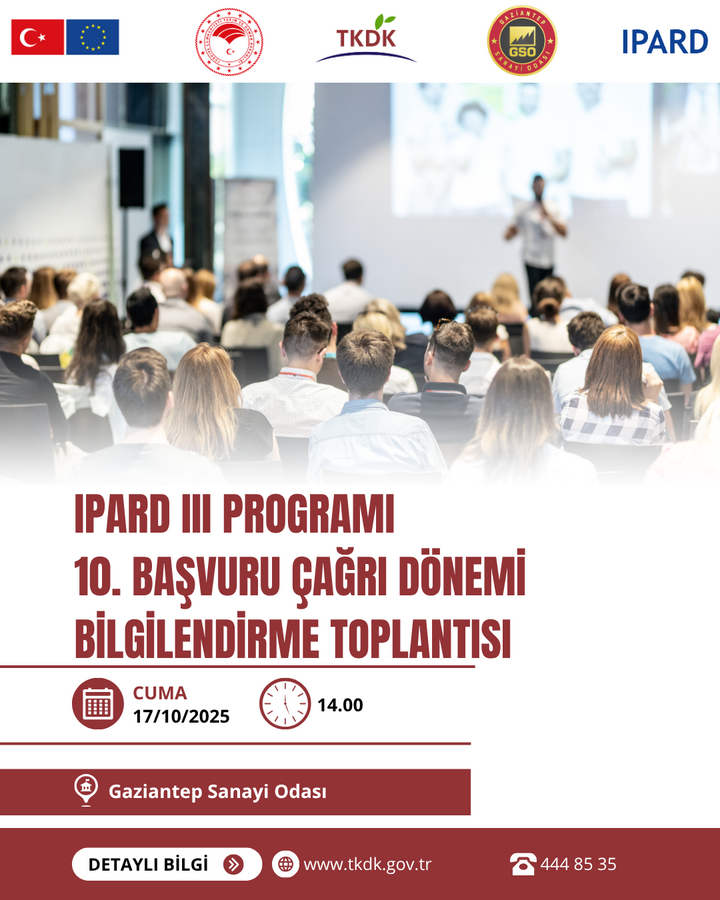 10.Başvuru Çağrı Dönemi ile ilgili olarak Odamız ve TKDK Gaziantep Ofisi iş birliğiyle Tarım ve Kırsal Kalkınmayı Destekleme Kurumu’nun IPARD III Programı 10. Başvuru Çağrı İlanı kapsamında üreticilere sağlayacağı destekler hakkında 17 Ekim 2025 Cuma, saat 14:00 te Odamız toplantı salonunda bilgilendirme programı düzenlenecektir.