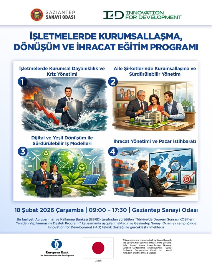 Avrupa İmar ve Kalkınma Bankası (EBRD) tarafından yürütülen "Türkiye'de Deprem Sonrası KOBİ'lerin Yeniden Yapılanmasına Destek Programı" kapsamında uygulanan, Gaziantep Sanayi Odası ev sahipliği ve Innovation for Development (I4D) teknik desteği ile "İşletmelerde Kurumsallaşma, Dönüşüm ve İhracat Eğitimi" 18 Şubat 2026 günü 09.00–17.30 saatleri arasında 5. Kat Meclis Salonu’nda gerçekleştirilecek olup, işletmelerin kurumsal kapasitelerini güçlendirmeyi ve ihracat yetkinliklerini artırmayı amaçlamaktadır.