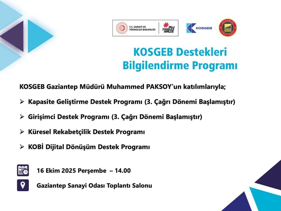 Bu bağlamda, 16 Ekim 2025 Perşembe günü saat 14:00’te Gaziantep Sanayi Odası Toplantı Salonunda “KOSGEB DESTEKLERİ BİLGİLENDİRME PROGRAMI” etkinliği düzenlenecektir.