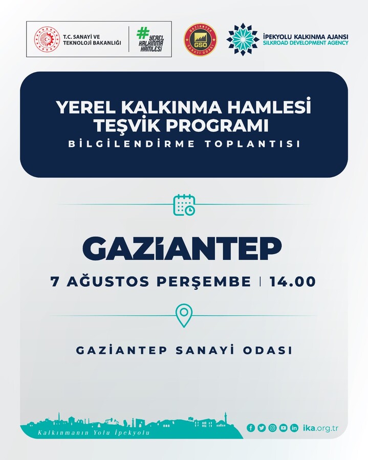 Sanayi ve Teknoloji Bakanlığı tarafından, Türkiye'nin kalkınma öncelikleri doğrultusunda hazırlanan Yerel Kalkınma Hamlesi Programı 2025 yılı çağrısı ilan edilmiştir. Programın temel amacı, bölgeler arası gelişmişlik farklarının azaltılması, yerel potansiyelin harekete geçirilmesi ve yerli üretim kapasitesinin artırılmasıdır. Program kapsamında her il özelinde 4 yatırım konusu belirlenmiş olup, Gaziantep için Yerel Kalkınma Hamlesi Yatırım Konuları;