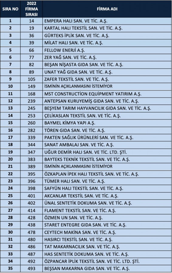 Türkiye'nin İkinci 500 Büyük Sanayi Kuruluşu-2022 Araştırması sonuçlarına göre Gaziantep’ten 35 firma listede yer aldı.